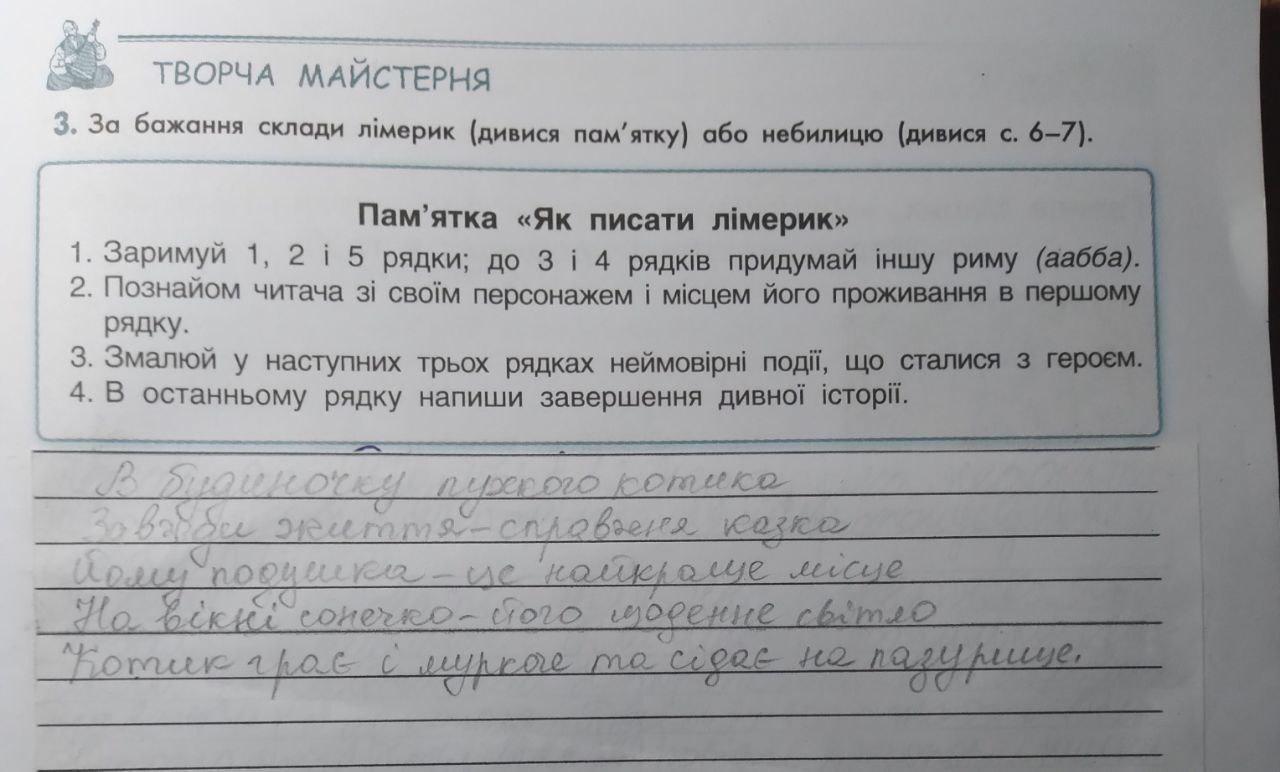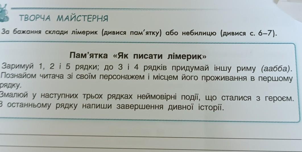 е- 7 вся СТЕРНЯ 3. За бажання склади лімерик (дивися пам'ятку) або небилицю (дивися с. 6–7). Пам'ятка «Як писати лімерик» 1. Заримуй 1, 2 і 5 рядки; до 3 і 4 рядків придумай іншу риму (аабба). 2. Познайом читача зі своїм персонажем і місцем його проживання в першому рядку. 3. Змалюй у наступних трьох рядках неймовірні події, що сталися з героем. 4. В останньому рядку напиши завершення дивної історії. будласка пж
