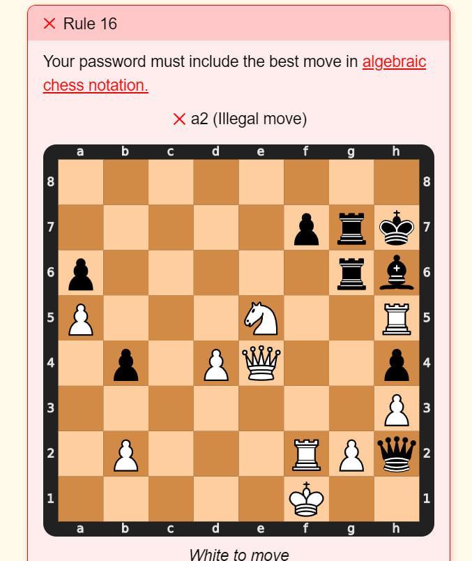 To comply with the given rule, your password should include the best move in algebraic chess notation. However, since "a2" is an illegal move, it cannot be considered the best move. Therefore, "a2" should not be included in your password.
