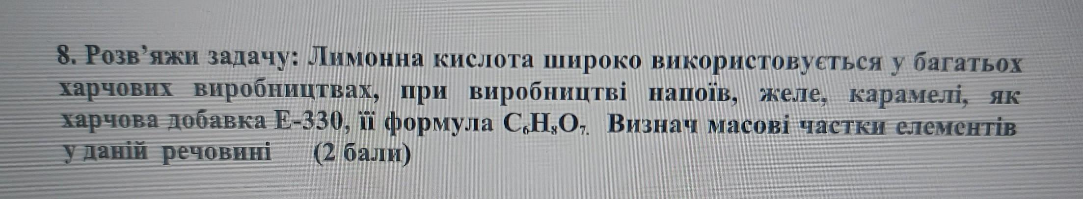 w(О)=7×Ar(О)/Mr(С6Н8О7)=7×16/192=0,583×100 %=58,3%