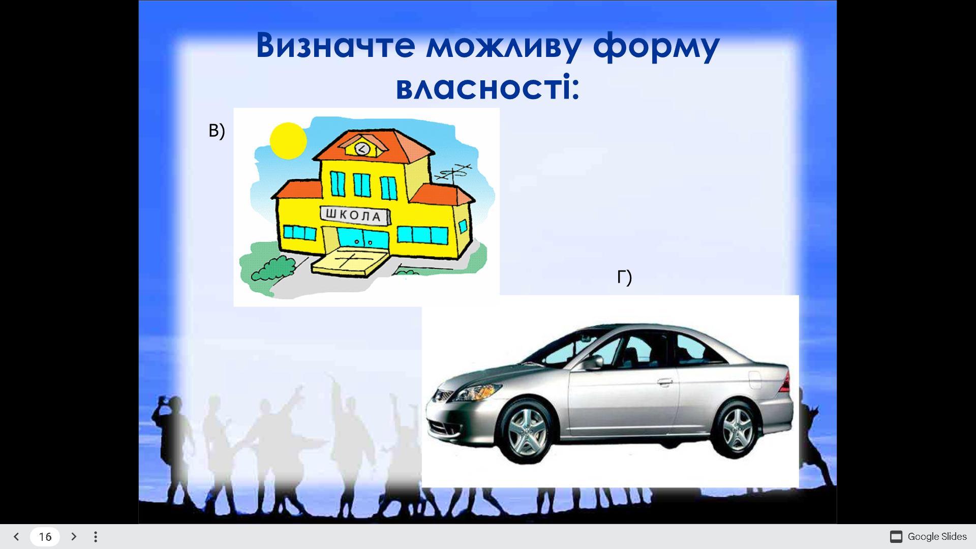 - г) автомобіль може бути у приватній, державної або орендованій власності.