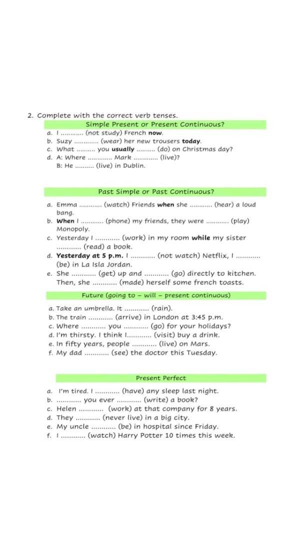 СРОЧНО ДАЮ 100 БАЛОВ 2. Complete with the correct verb tenses. Simple Present or Present Continuous? a. 1 b. Suzy (not study) French now. ........ (wear) her new trousers today. c. What d. A: Where you usually Mark (do) on Christmas day? (live)? B: He (live) in Dublin, Past Simple or Past Continuous? a. Emma bang. (hear) a loud (watch) Friends when she b. When 1............ (phone) my friends, they were Monopoly. (play) c. Yesterday I.......... (work) in my room while my sister ............. (read) a book. d. Yesterday at 5 p.m. I...... (be) in La Isla Jordan. (not watch) Netflix, I e. She............ (get) up and............ (go) directly to kitchen. Then, she (made) herself some french toasts. Future (going to will present continuous) a. Take an umbrella. It....... (rain). b. The train (arrive) in London at 3:45 p.m. c. Where............. you............ (go) for your holidays? d. I'm thirsty. I think ............ (visit) buy a drink. e. In fifty years, people..... (live) on Mars. f. My dad.... (see) the doctor this Tuesday. a. I'm tired. I Present Perfect (have) any sleep last night. b............. you ever........... (write) a book? c. Helen (work) at that company for 8 years. d. They............. (never live) in a big city. e. My uncle... (be) in hospital since Friday. f. I........... (watch) Harry Potter 10 times this week.