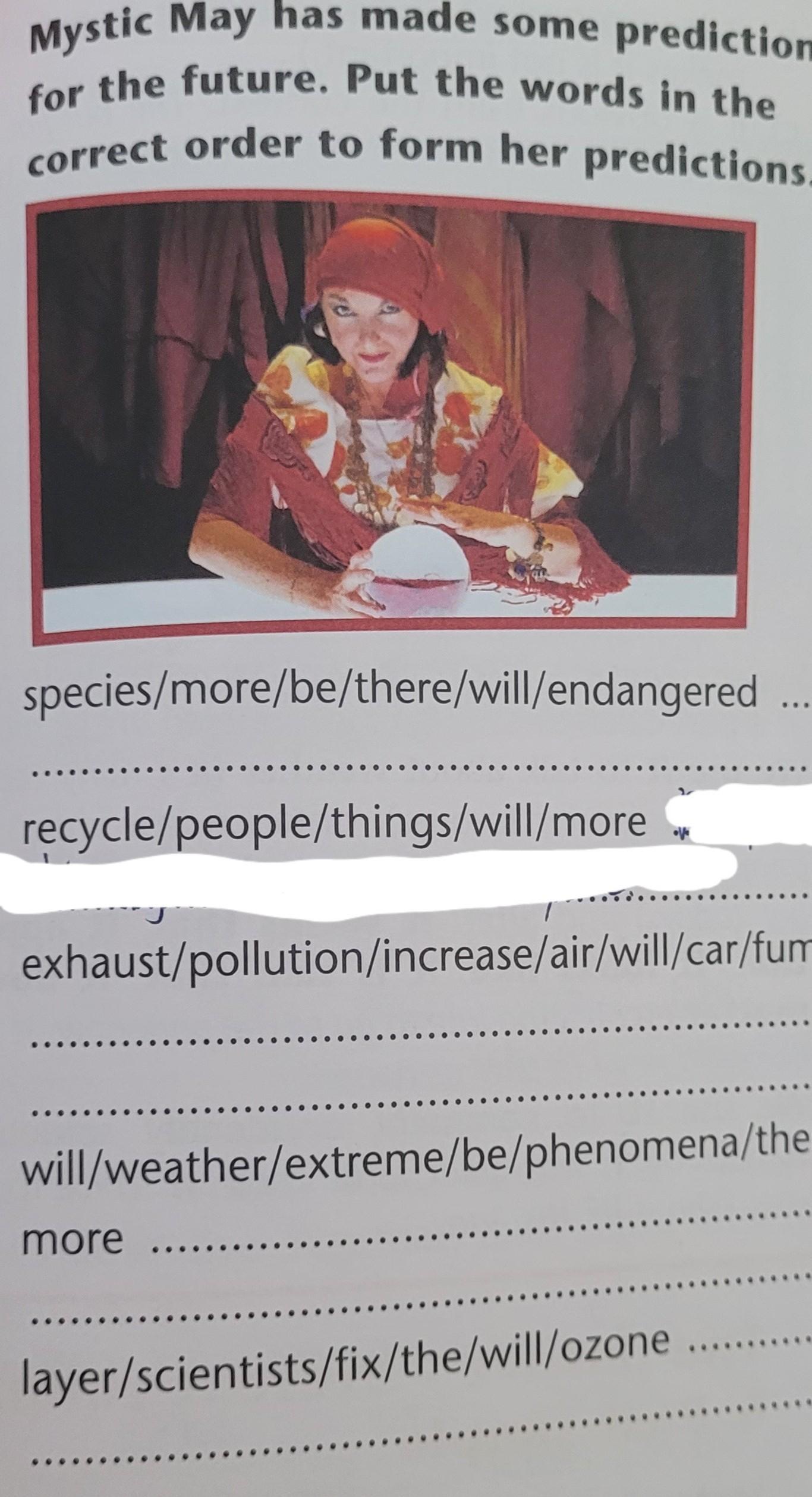 2 Mystic May has made some predictions for the future. Put the words in the correct order to form her predictions. 1 species/more/be/there/will/endangered .... 2 recycle/people/things/will/more Peopl. ell. things more resyale..... rosyale.. 3 exhaust/pollution/increase/air/will/car/fumes 4 will/weather/extreme/be/phenomena/there/ more ..... 5 layer/scientists/fix/the/will/ozone........