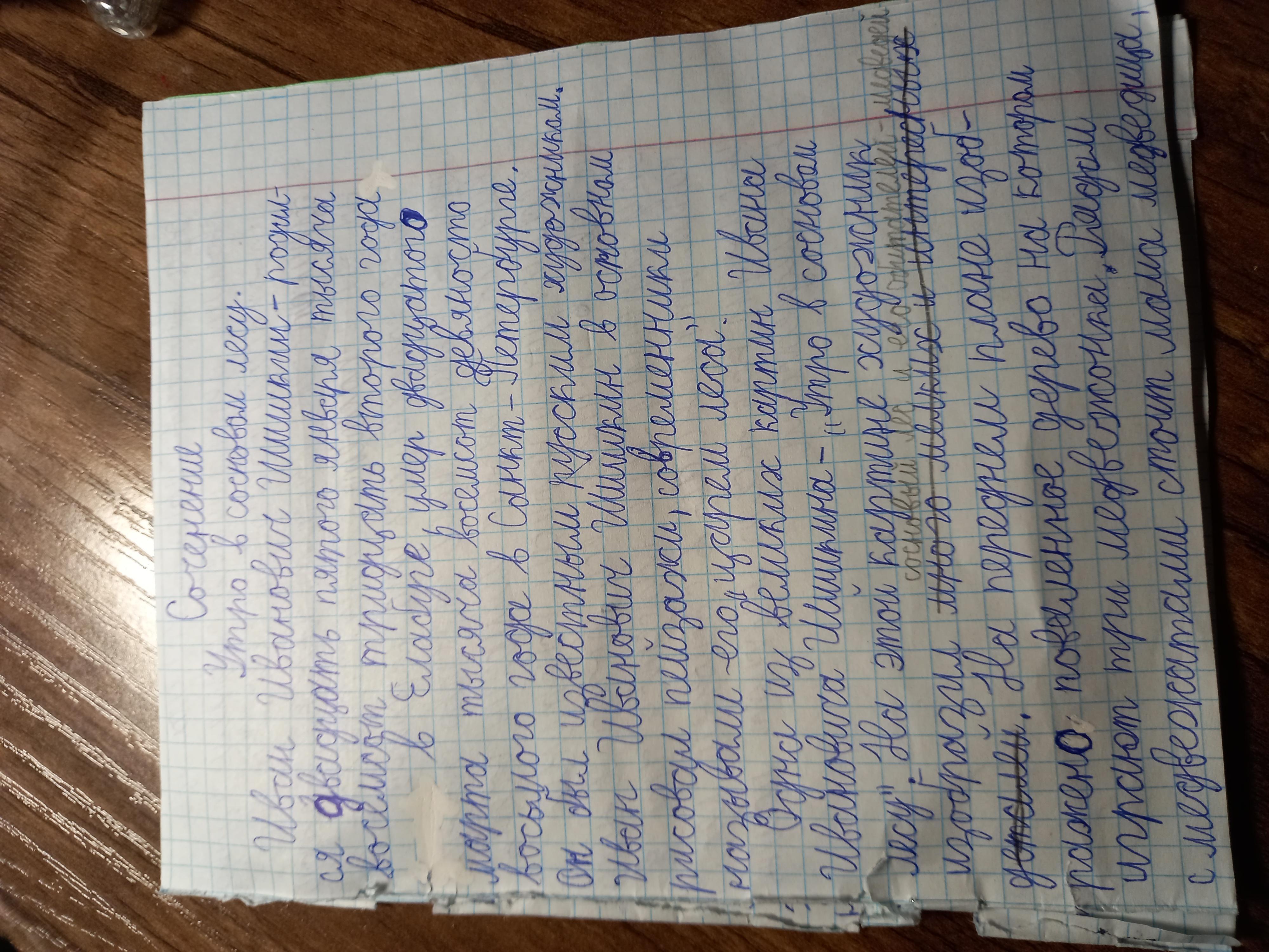 Упражнение 251. Работа по картине И.И.Шишкина Утро в сосновом лесу». (См. стр. 236) 1. Рассмотрите репродукцию. И.И. Шишкин прекрасно знал лес и умел передать всю его прелесть Почему даже одна эта картина позволяет нам утверждать, что и величие? Что изображено на переднем плане картины? На заднем плане? 2. Составление рабочих материалов к сочинению по картине. Как на картине показано утро? Какие краски для этого изображения использует художник? (Светлый кусочек неба, серая дымка, чуть розовые стволы деревьев, освещенные первыми лучами солнца). Как изображается художником лес? (Темный, глухой, мрач- ный.) Обратите внимание на изображение сосен. Как можно описать эти деревья? (Вековые сосны, покрытые мхом. Нижние ветви сломаны. Дерево, поваленное бурей). Опишите фрагмент картины, где изображены медведица и медвежата. Какие они? (Один медвежонок залез на ствол сосны довольно высоко. Второй забирается к нему. Третий встал на задние лапы.) Что вы можете сказать о повадках этих медвежат? А медведица? Спокойна ли она или тревожится за малышей? 3. Какое впечатление производит эта картина? Выскажите свое - - мнение. 4. Напишите сочинение по картине И.И. Шишкина «Утро в сосновом лесу».
