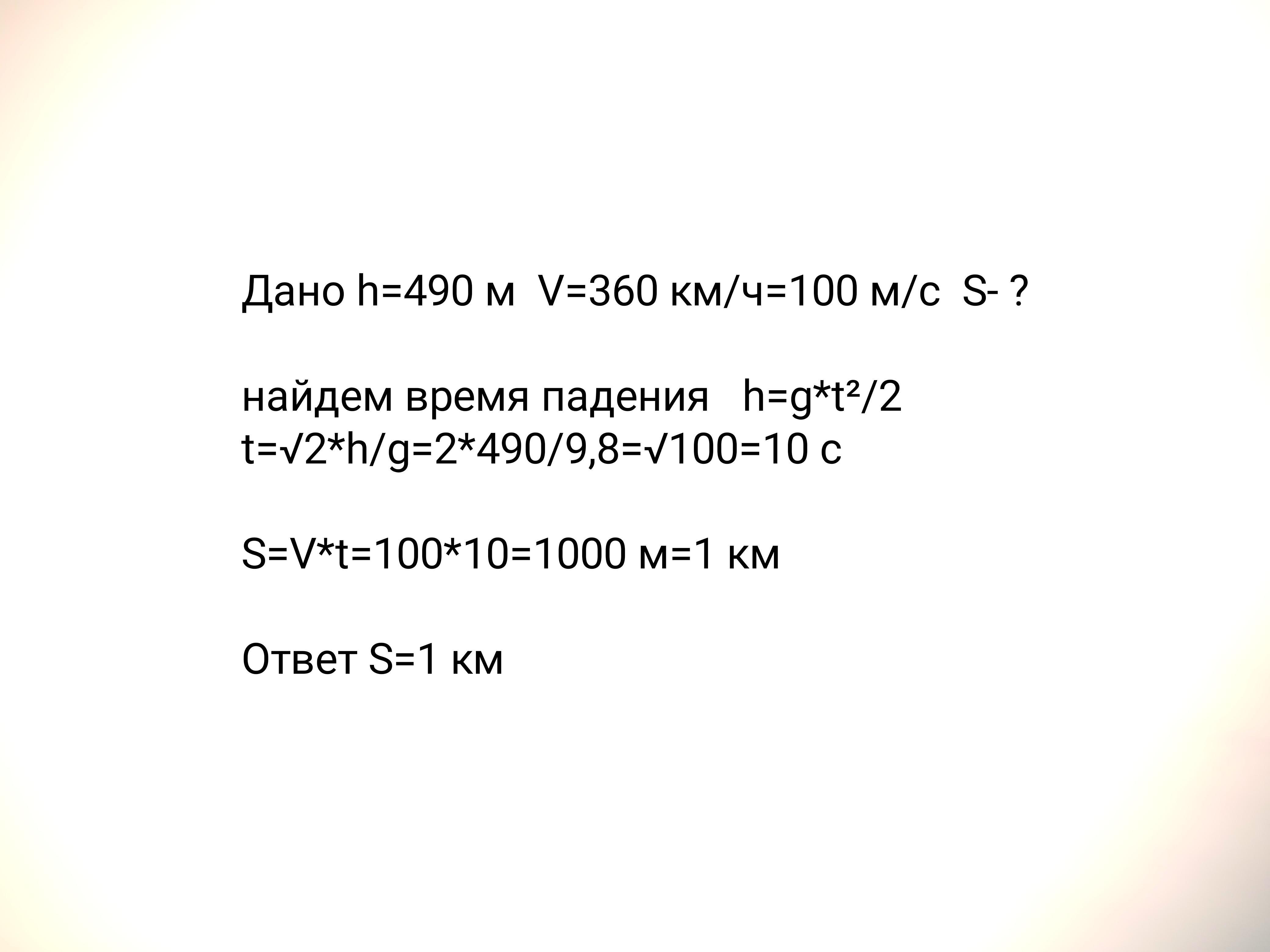2. Самолет летит горизонтально со скоростью 360 км/ч на высоте 490 м. Когда самолет пролетает над точкой О, с него сбрасы- вают предмет. На каком расстоянии от точки О предмет упадет на Землю? Принять g = 9,8 м/с², сопротивление воздуха не учи- тывать. DIUS K горизонту брошена гра- 150