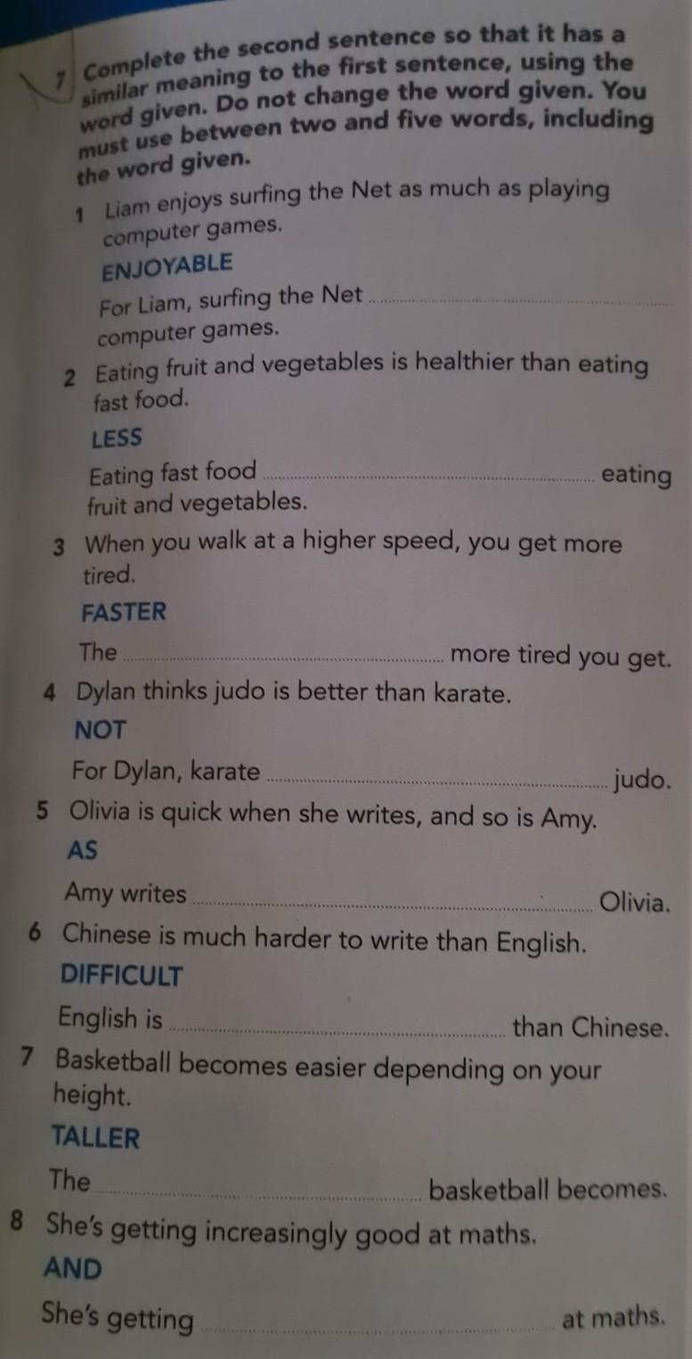 Complete the second sentence so that it has a similar meaning to the first sentence, using the word given. Do not change the word given. You must use between two and five words, including the word given. 1 Liam enjoys surfing the Net as much as playing computer games. ENJOYABLE For Liam, surfing the Net computer games. 2 Eating fruit and vegetables is healthier than eating fast food. LESS Eating fast food fruit and vegetables. 3 When you walk at a higher speed, you get more tired. FASTER The 4 Dylan thinks judo is better than karate. NOT more tired you get. For Dylan, karate 5 Olivia is quick when she writes, and so is Amy. AS eating Amy writes 6 Chinese is much harder to write than English. DIFFICULT English is 7 Basketball becomes easier depending on your height. TALLER The 8 She's getting increasingly good at maths. AND She's getting judo. Olivia. than Chinese. basketball becomes. at maths
