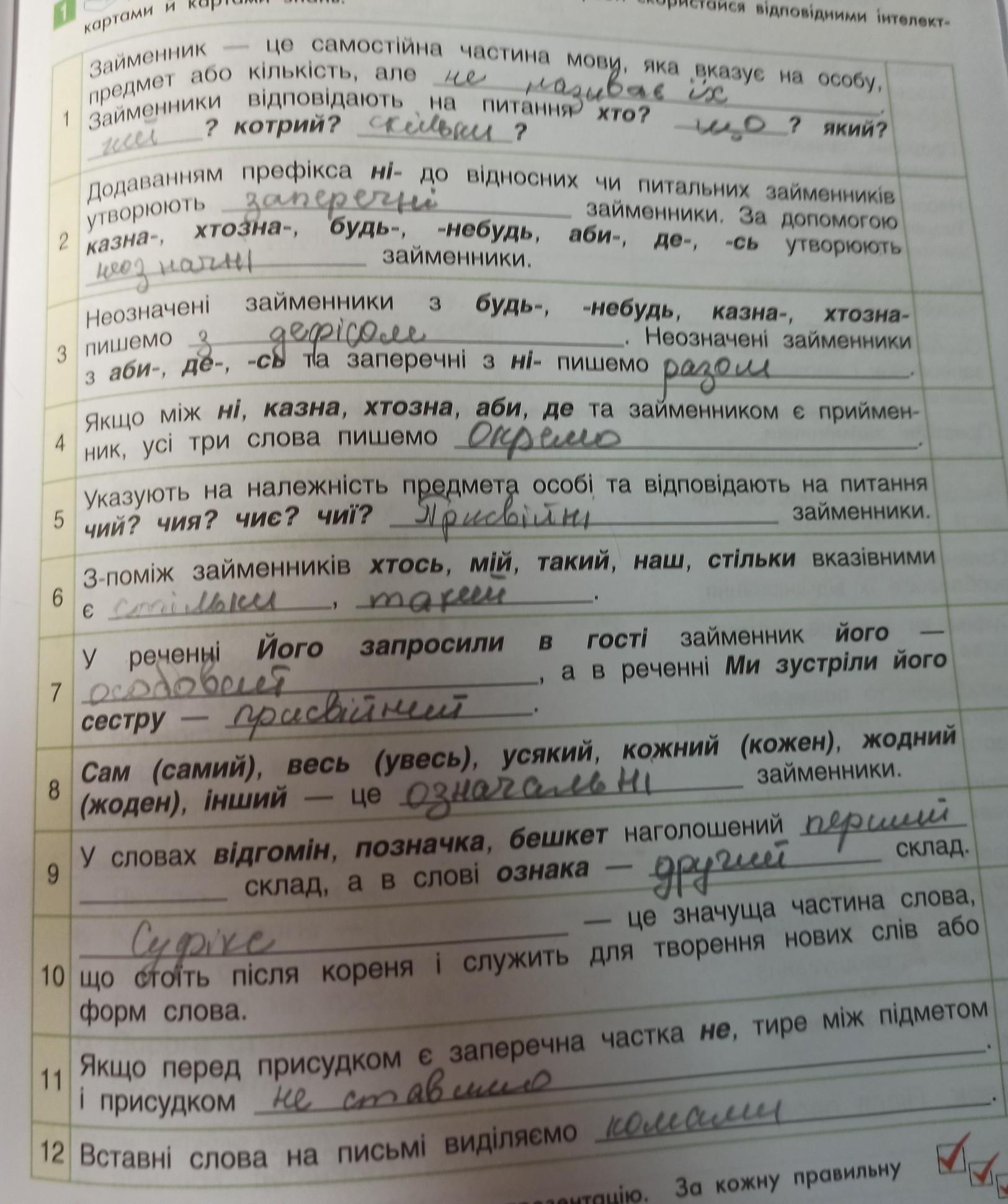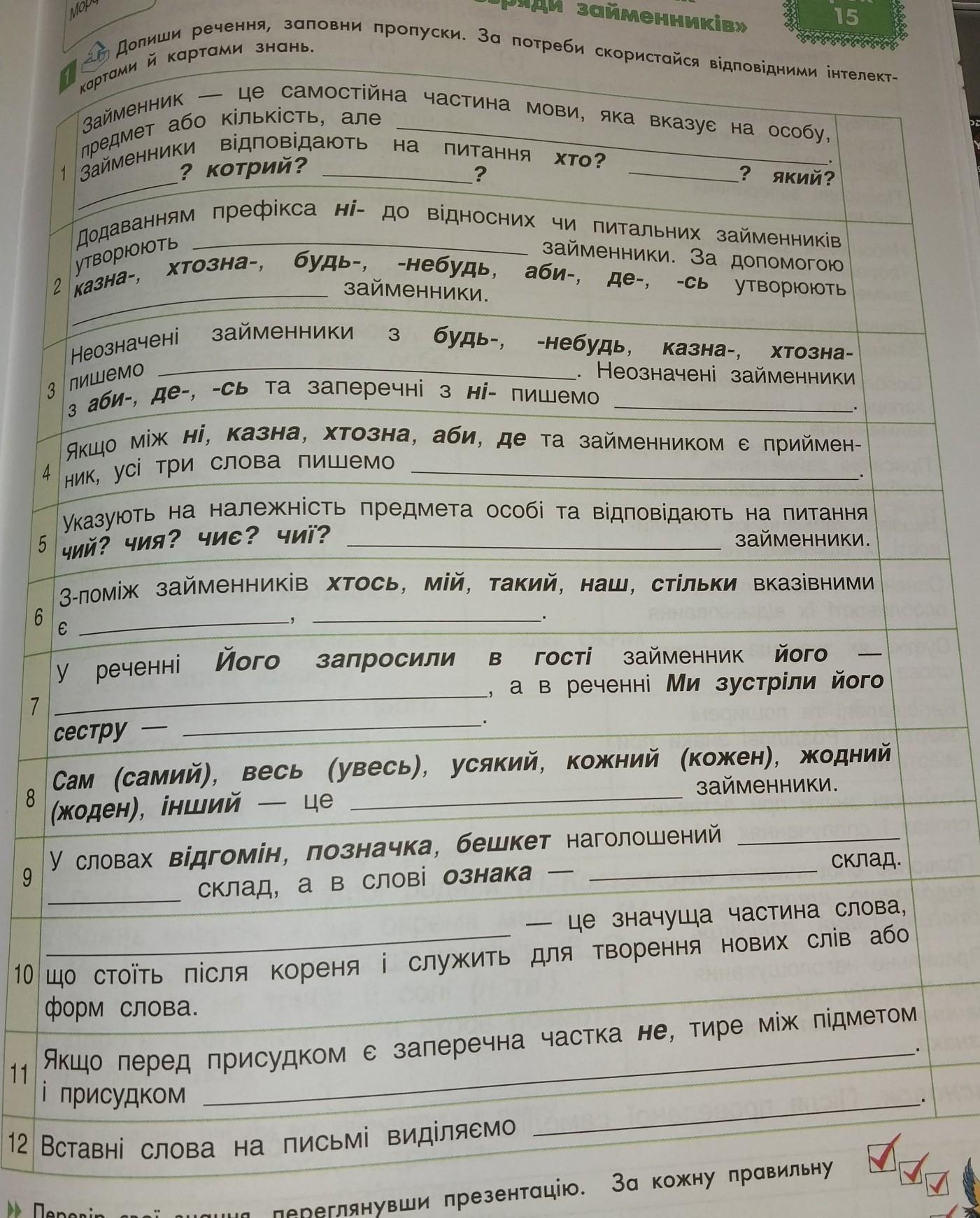 сли ле и Д 11 7 8 Допиши речення, заповни пропуски. За потреби скористайся вiдповiдними телект- коргон й кортами знань. Займенник це самостійна частина мови, яка вказус на особу. предмет або кiлькiсть, але 1 займенники вiдповiдають ? котрий? Додаванням префікса нİ- до вiдносних чи питальних займенників утворюють казна-, 4 5 AA хтозна-, Неозначенi у реченні сестру займенники 3 пишемо 3 аои-, де-, -сь та заперечнi з нi- пишемо Якщо мiж нi, казна, хтозна, аби, де та займенником е приймен- ник, усı три слова пишемо чий? чия? чис? чиï? Указують на належність предмета особi та відповідають на питання З-поміж займенникiв хтось, мій, такий, наш, стiльки вказівними займенники. 6 € Його на ямонник розряди займенників питання ? будь-, -небудь, займенники. 3 будь- запросили це хто? займенники. За допомогою аби-, де-. -сь утворюють Уpok 15 ? який? -небудь. казна-. Неозначенi займенники Хтозна- у словах відгомін, позначка, бешкет наголошений склад, а в слові ознака 9 B гості займенник його а в реченні ми зустріли його Сам (самий), весь (увесь), усякий, кожний (кожен), жодний (жоден), інший займенники. - - склад. це значуща частина слова, 10 ЩО СТОïть пiсля кореня служить для творення нових слів або форм слова. Якщо перед присудком є заперечна частка не, тире між підметом і присудком 12 Вставні слова на письмi видiляемо » Перевір свої знання, переглянувши презентацію. За кожну правильну вiдповiдь ти отримаєш 1 бал. да 45 балив пж срочно