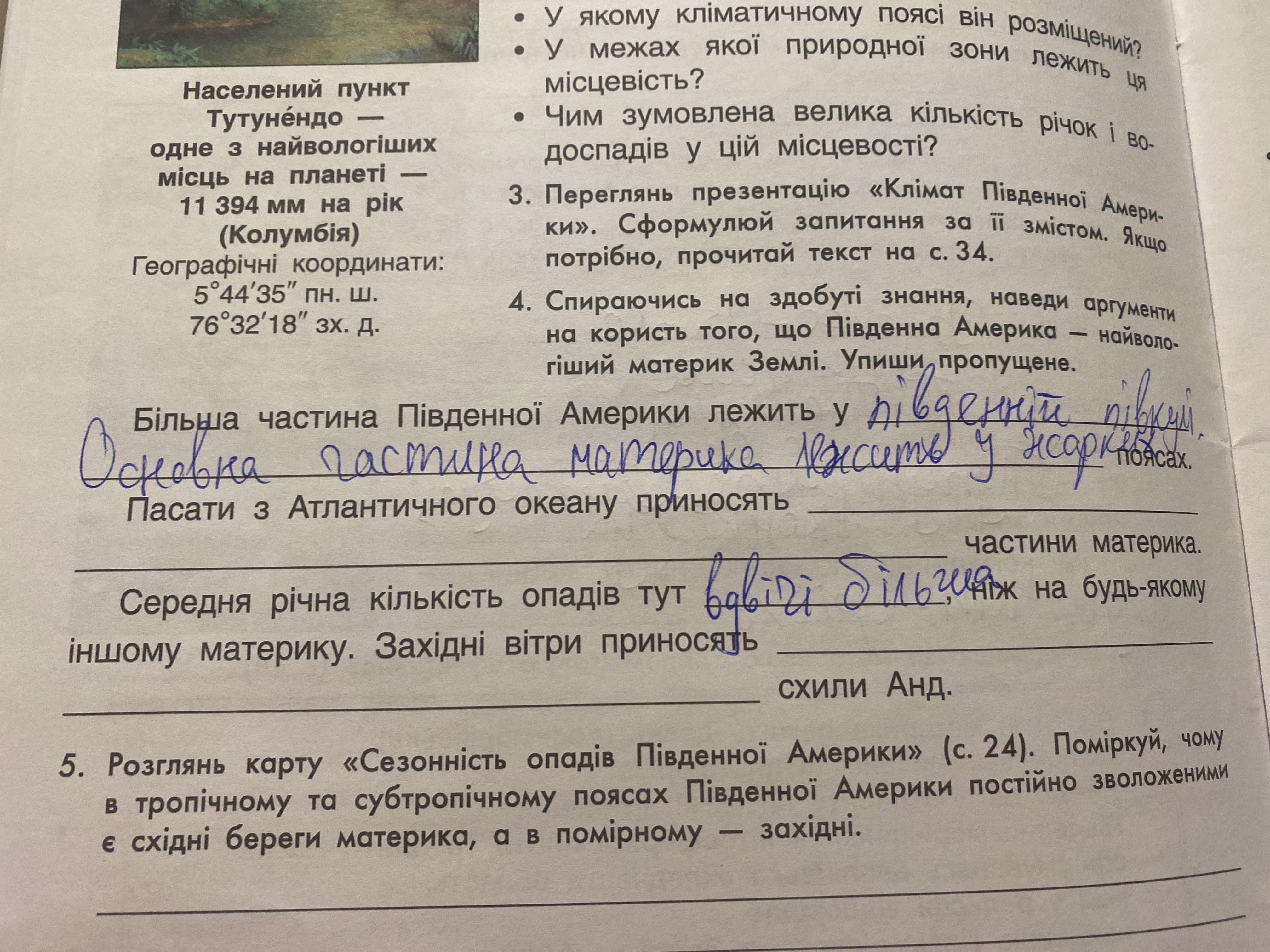 - Спираючись на здобуті знання, наведи аргументи на користь того, що Південна Америка - найвологіший материк Землі. Упиши пропущене.