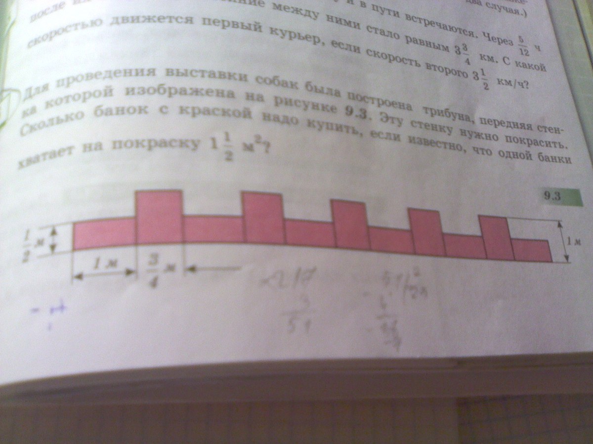 (1*1/2*6)+(3/4*1*5)=6,75квадратных метров площадь трибуны. 6,75/1,5=4,5 банки краски нужно.