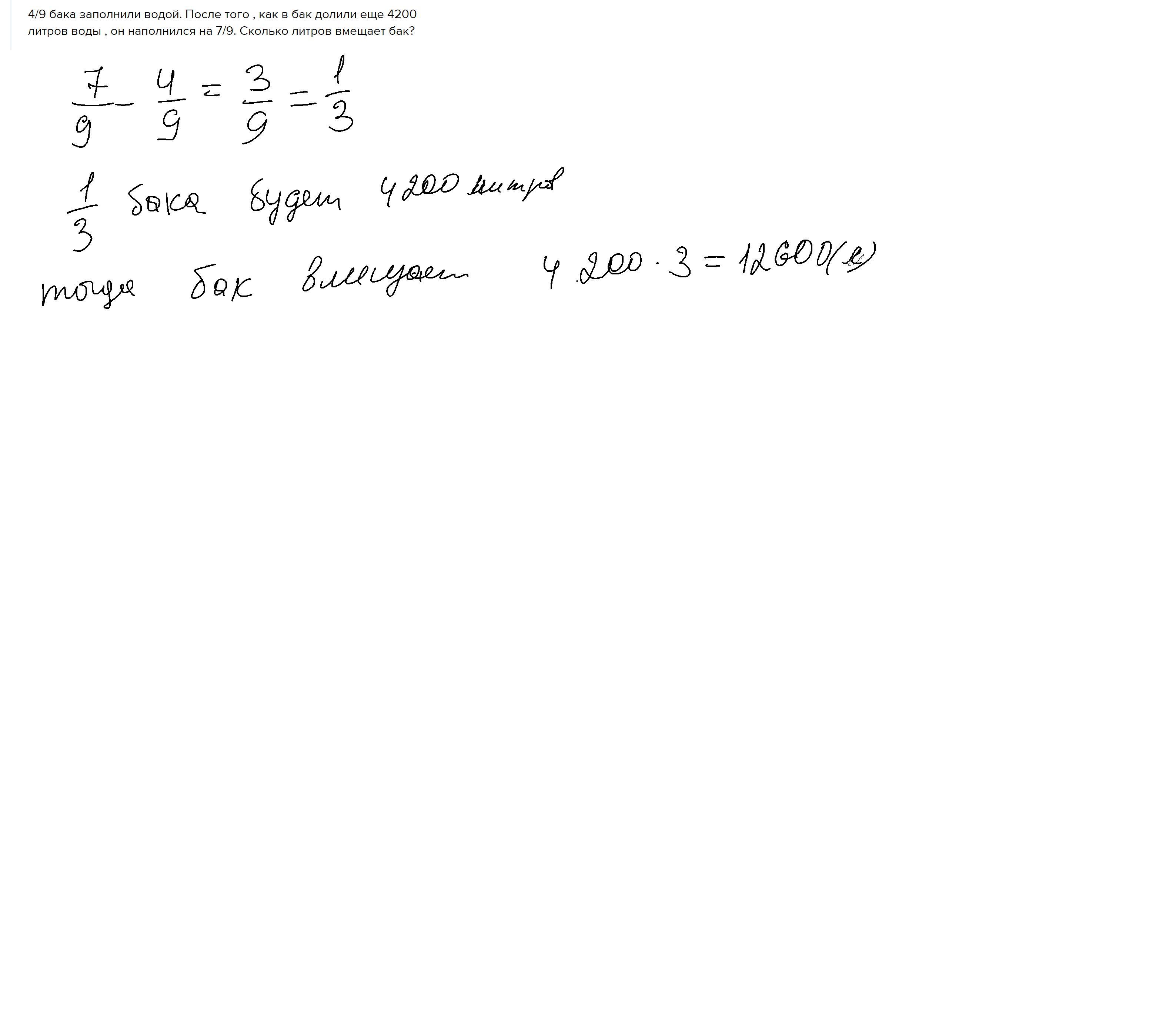 4/9 бака заполнили водой. После того , как в бак долили еще 4200 литров воды , он наполнился на 7/9. Сколько литров вмещает бак?