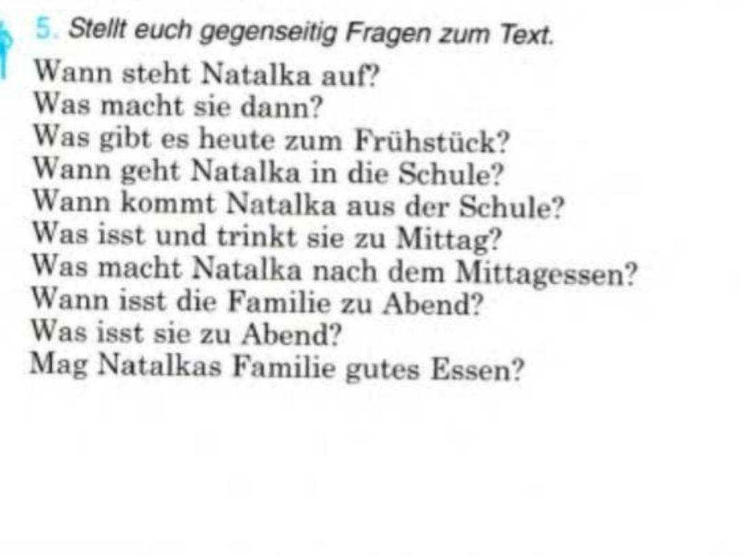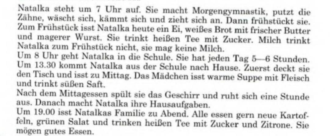 Natalka steht um 7 Uhr auf. Sie macht Morgengymnastik, putzt die Zähne, wäscht sich, kämmt sich und zieht sich an. Dann frühstückt sie. Zum Frühstück isst Natalka heute ein Ei, weißes Brot mit frischer Butter und magerer Wurst. Sie trinkt heißen Tee mit Zucker. Milch trinkt Natalka zum Frühstück nicht, sie mag keine Milch.