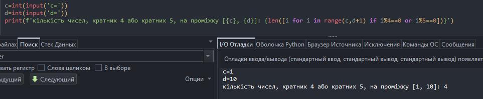 print(f'кількість чисел, кратних 4 або кратних 5, на проміжку [{c}, {d}]: {len([i for i in range(c,d+1) if i%4==0 or i%5==0])}')