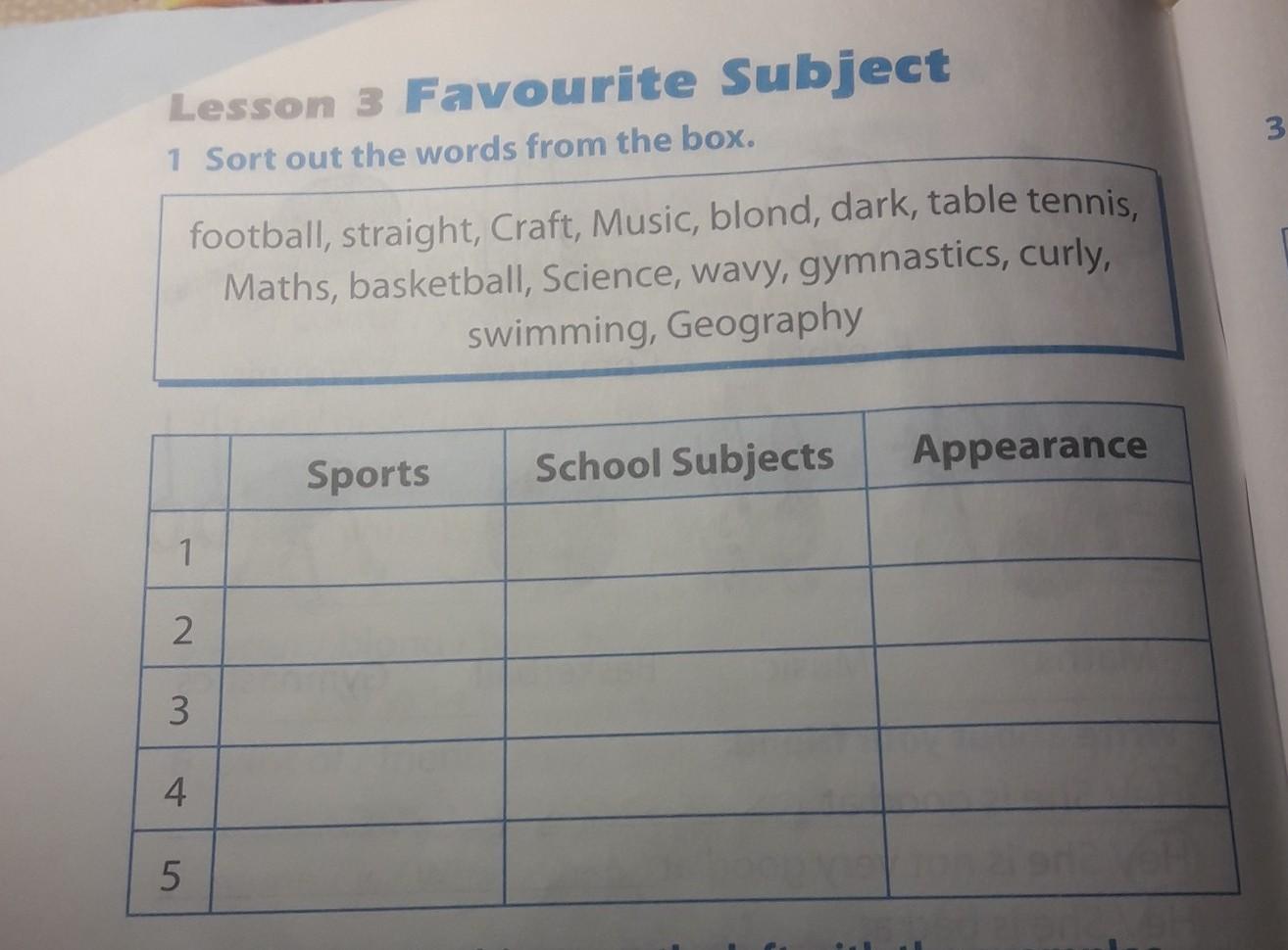 Sports: football, basketball, table tennis, gymnastics, swimming.