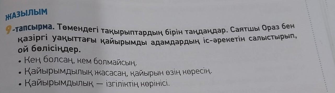 9-тапсырма. Төмендегі тақырыптардың бірін таңдаңдар. Саятшы Ораз бен қазіргі уақыттағы кайырымды адамдардың іс-әрекетін салыстырып, ой белісіндер. Кең болсаң, кем болмайсын. • . Кайырымдылық жасасаң, қайырын өзің көресің. . . Кайырымдылық - iзгiлiктiн көрiнiсi.