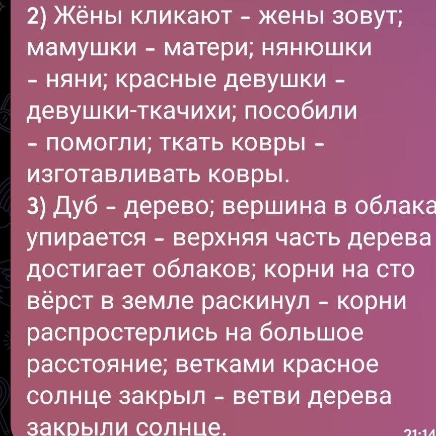 1) Пустил стрелу средний брат полетела к богатому купцу во двор и упала у красного крыльца. 2) Стали жёны кликать мамушек, нянюшек и красных девушек чтобы пособили им ткать ковры. 3) Стоит дуб, вер- шиной в облака упирается, корни на сто вёрст в земле раскинул, ветками красное солнце закрыл.