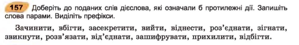 Зачинити - відчинити, вбігти - вибігти, засекретити - розсекретити, вийти - уйти, віднести - принести, роз'єднати - з'єднати, зігнати - розігнати, звикнути - відвикнути, розв'язати - зав'язати, від'єднати - приєднати, зашифрувати - розшифрувати, прихилити - нахилити, відбігти - підбігти.