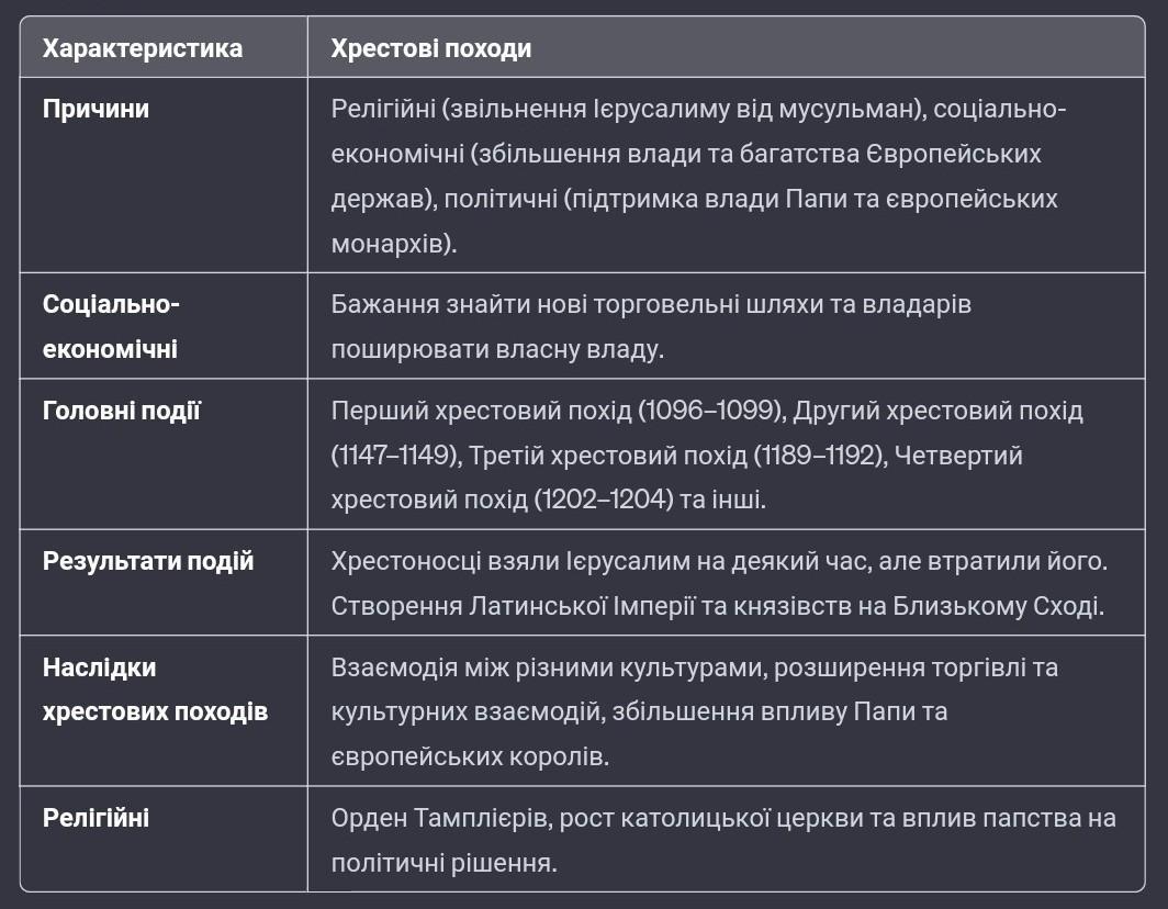 Діємо: практичні завдання Працюючи з текстом підручника, заповніть таблицю «Хрестові походи». Структуру таблиці розробіть спільно в класі або скорис- тайтеся запропонованою. Причини хрестових походів Соціально- економічні Головні події Результати подій Наслідки хрестових походів Релігійні