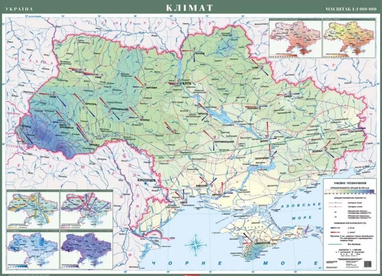 Розгляньте в атласі й підручнику карти «Клімат України». «Синоптична карта» й «Агрокліматичне районування» та дайте відповіді на запитання: а) Які основні елементи клімату зображені на кліматичній карті?