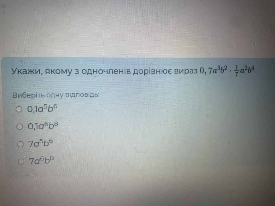 0,7×1/7=0.1. a²b⁴×a³b²=a⁵b⁶ 0,1×a⁵b⁶=0,1a⁵b⁶