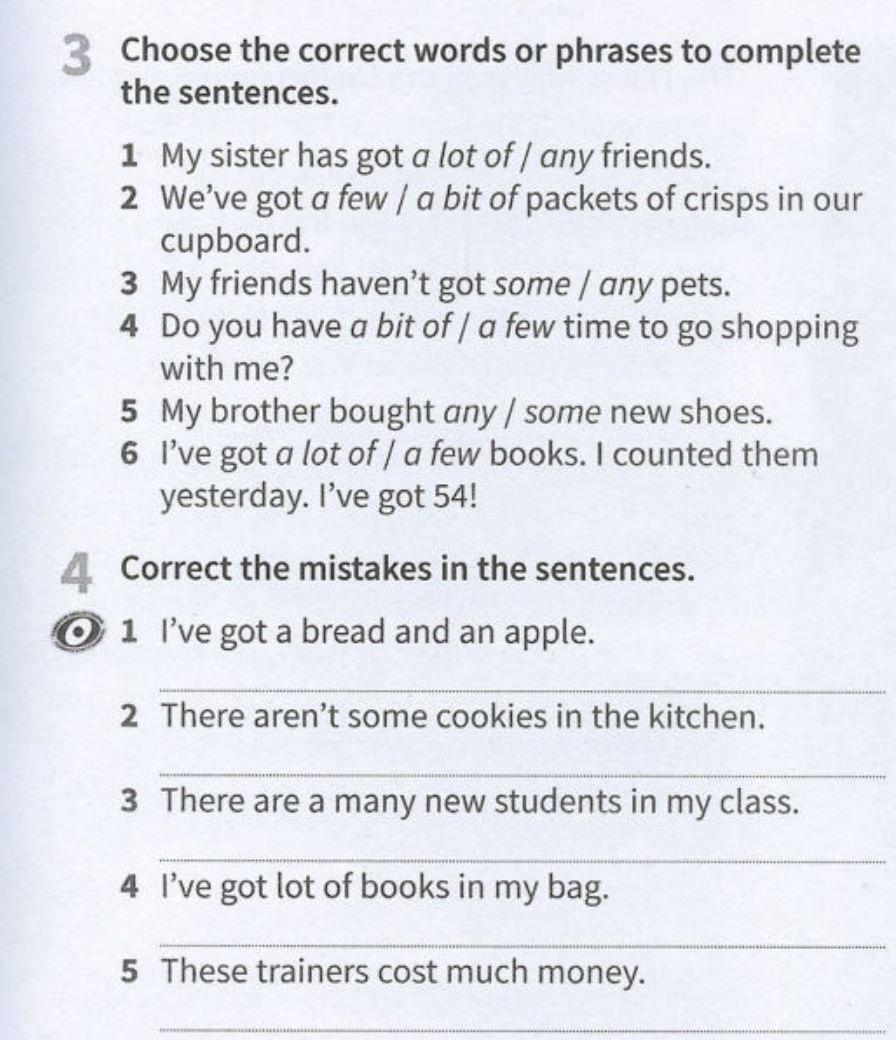 I've got bread and an apple; there aren't any cookies in the kitchen; there are a lot of new students in my class; I've got a lot of books in my bag; these trainers cost a lot of money.
