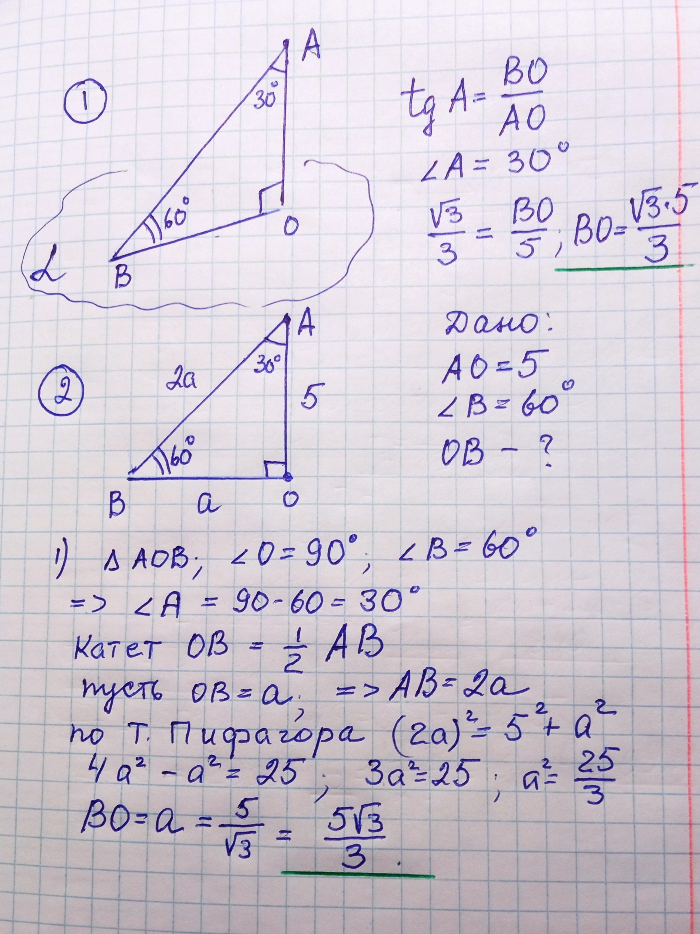 До площини а проведено похилу АВ і перпендикуляр АО. Знайти довжину проекції ВО, якщо АО=5см, а кут між похилою та