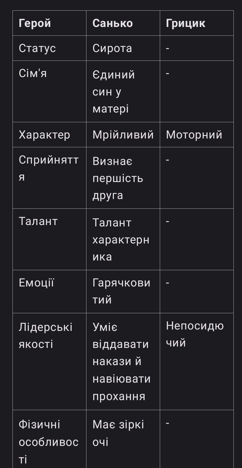 Заповніть таблицю, записавши до неї характеристики героїв із довідки