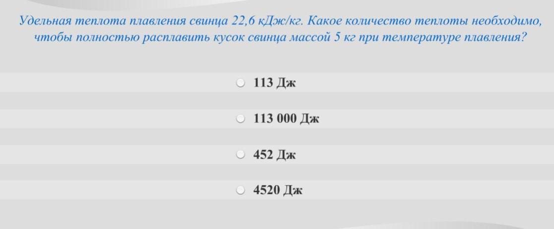 Удельная теплота плавления свинца 22,6 кДж/кг. Какое количество теплоты необходимо, чтобы полностью расплавить кусок свинца массой 5 кг при температуре плавления? пожалуйста помогите