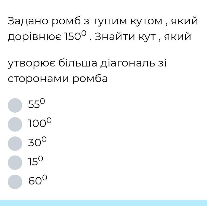діагонвль ромба ділить кут навпіл, а тому 30÷2=15