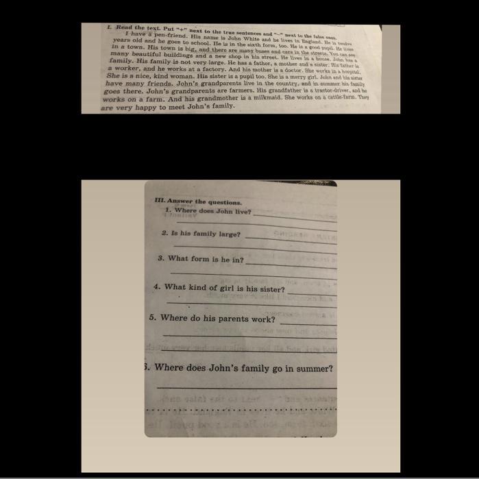 1 in England 2 no it isn't 3 the sixth, 4 she's a merry girl and has got many friends, 5 his father is a factory worker and his mother is a doctor 6 to the country where his grandparents live...