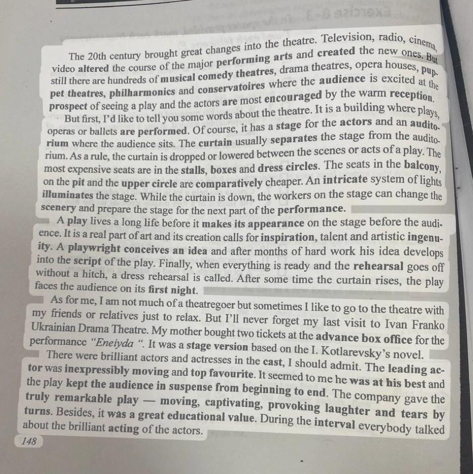 In the 20th century, many changes happened in the theatre because of television, radio, cinema, and video, but there are still many exciting musical comedy theatres, drama theatres, opera houses, puppet theatres, philharmonics, and conservatoires where people enjoy seeing plays and actors feel happy with the warm reception.