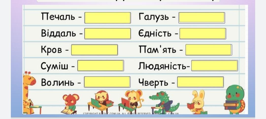 Поставте слова в орудному відмінку—Печаль, Віддаль, Кров, Суміш, Волинь, Галузь, Єдність, Пам'ять, Людяність, Чверть.