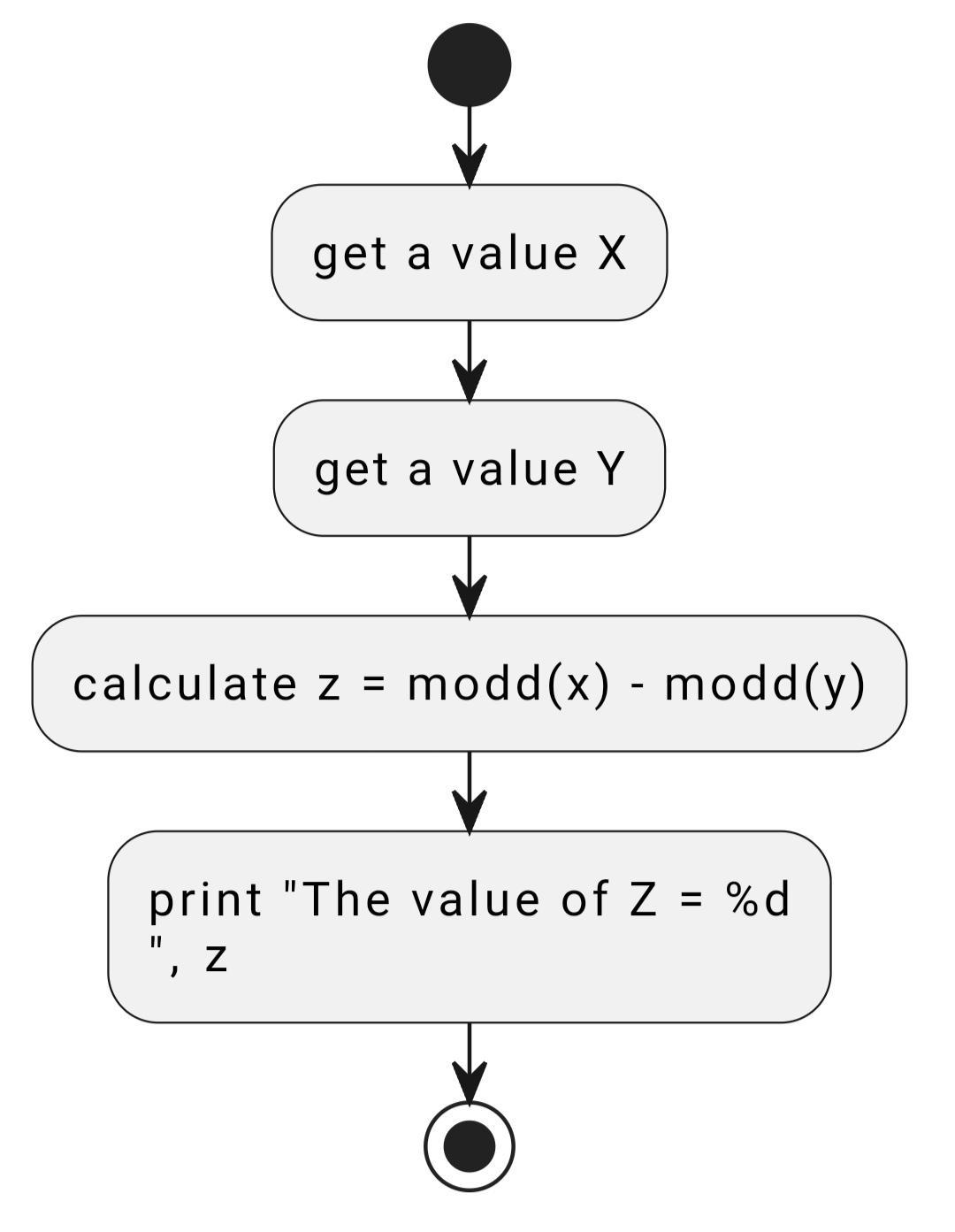 Условие: Рассчитать значение z = modd(x)-modd(y), написав и используя функцию modd(a), равную modd(a) = a, если а >= 0, modd(a) = - a, если а