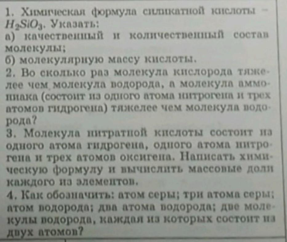1. а) Химическая формула силикатной кислоты H2SiO3 указывает на качественный и количественный состав молекулы следующим образом: два атома водорода (Н2), один атом кремния (Si) и три атома кислорода (O3). Буквенное представление химической формулы указывает на соотношение атомов в молекуле.