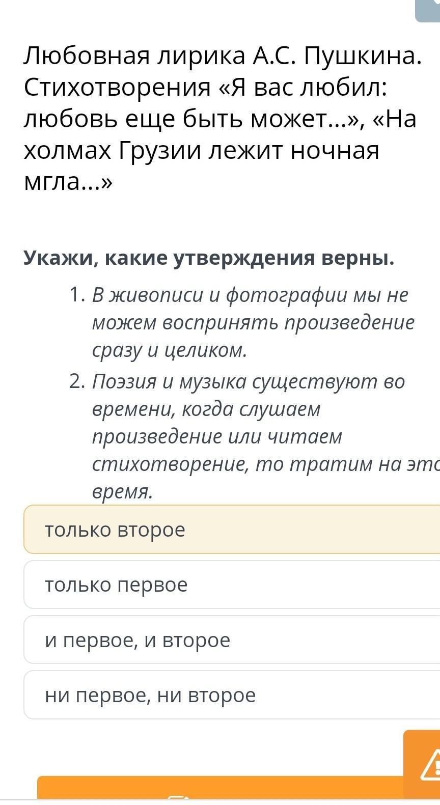 Укажи, какие утверждения верны. 1. В живописи и фотографии мы не можем воспринять произведение сразу и целиком. 2. Поэзия и музыка существуют во времени, когда слушаем произведение или читаем стихотворение, то тратим на это время.
