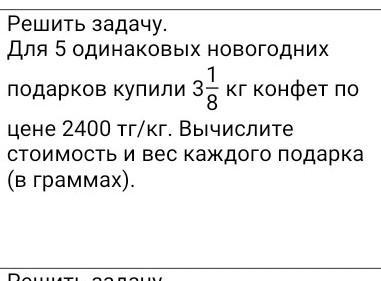 No Задание п/п 1 Решить задачу. Для 5 одинаковых новогодних 1 подарков купили 32 кг конфет по цене 2400 тг/кг. Вычислите стоимость и вес каждого подарка (в граммах). D FI