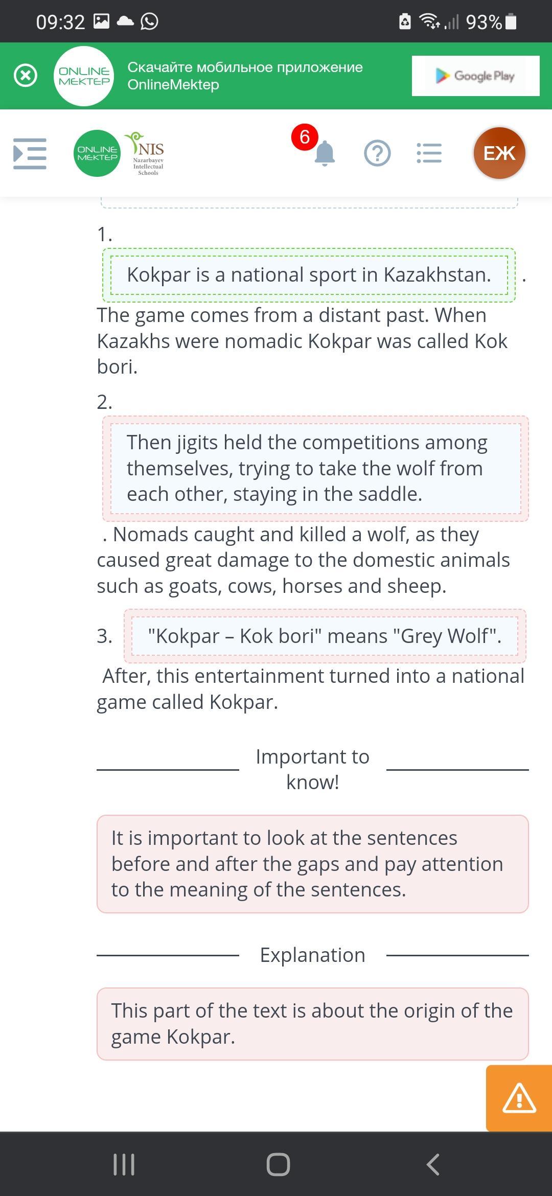 Read the parts of the text and drag the sentences to complete the text. 4) Then jigits held the competitions among themselves, trying to take the wolf from each other, staying in the saddle. + Kokpar is a national sport in Kazakhstan. "Kokpar - Kok bori" means "Grey Wolf". 1. . The game comes from a distant past. When Kazakhs were nomadic Kokpar was called Kok bori. 2. Nomads caught and killed a wolf, as they caused great damage to the domestic animals such as goats, cows, horses and sheep.