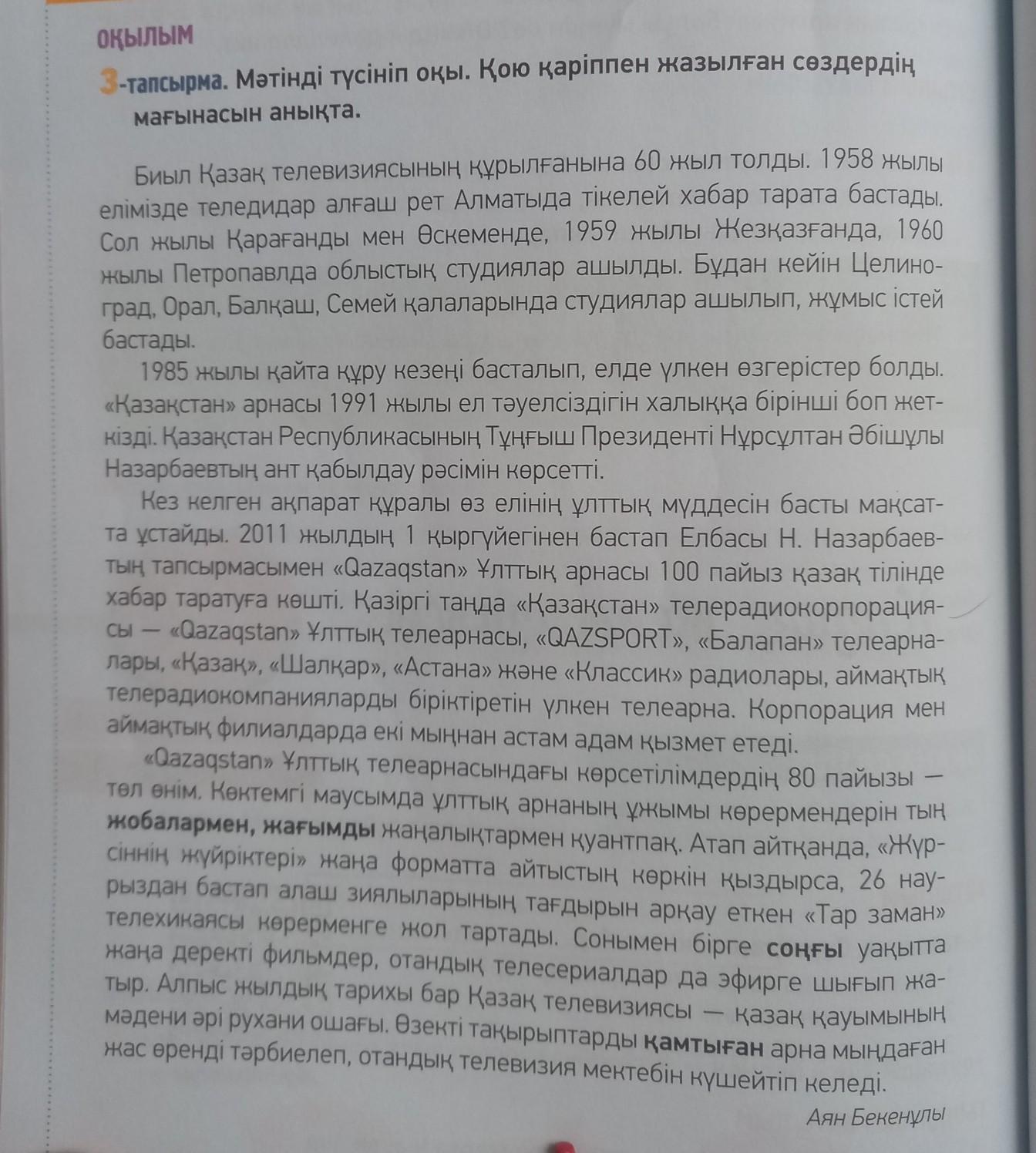 ЖАЗЫЛЫМ 4-тапсырма. «Түсінік» ойыны. 1. Мәтіннен тірек сөздерді тауып, әрқайсысына 2-3 ассоциация сезден жаз. 2. Оның iшiндегi 1 негiзгi сезді белгіле. 1. Теледидар: 2. Теледидар: 3. Теледидар 1. жаналык жаналык 2. енер 3. кино 3. Белгiлеген сөздi өзiң калай түсінетінiндi жаз. 4. Әр оқушы тізбекпен тірек сөзге берген анықтаманы окысын. Ұқсастық- тарды белiп, сызсын. 5. Ортақ түсінікті жазындар. Салыстырыңдар. Үлгі: тірек сөздер: теледидар, арна, ... , ... . 4. сериал 5. жарнама - 1. халыкты елде болып жатқан жаналыктармен таныстырады Tipek 4. Теледидар 5. Теледидар Әр окушы белгі- Барлык окушы леген сездерiне «теледидар» берген түсінігін сезiне берген окиды тусiнiктерiн салыстырады. Ортак шешiм шыгарады
