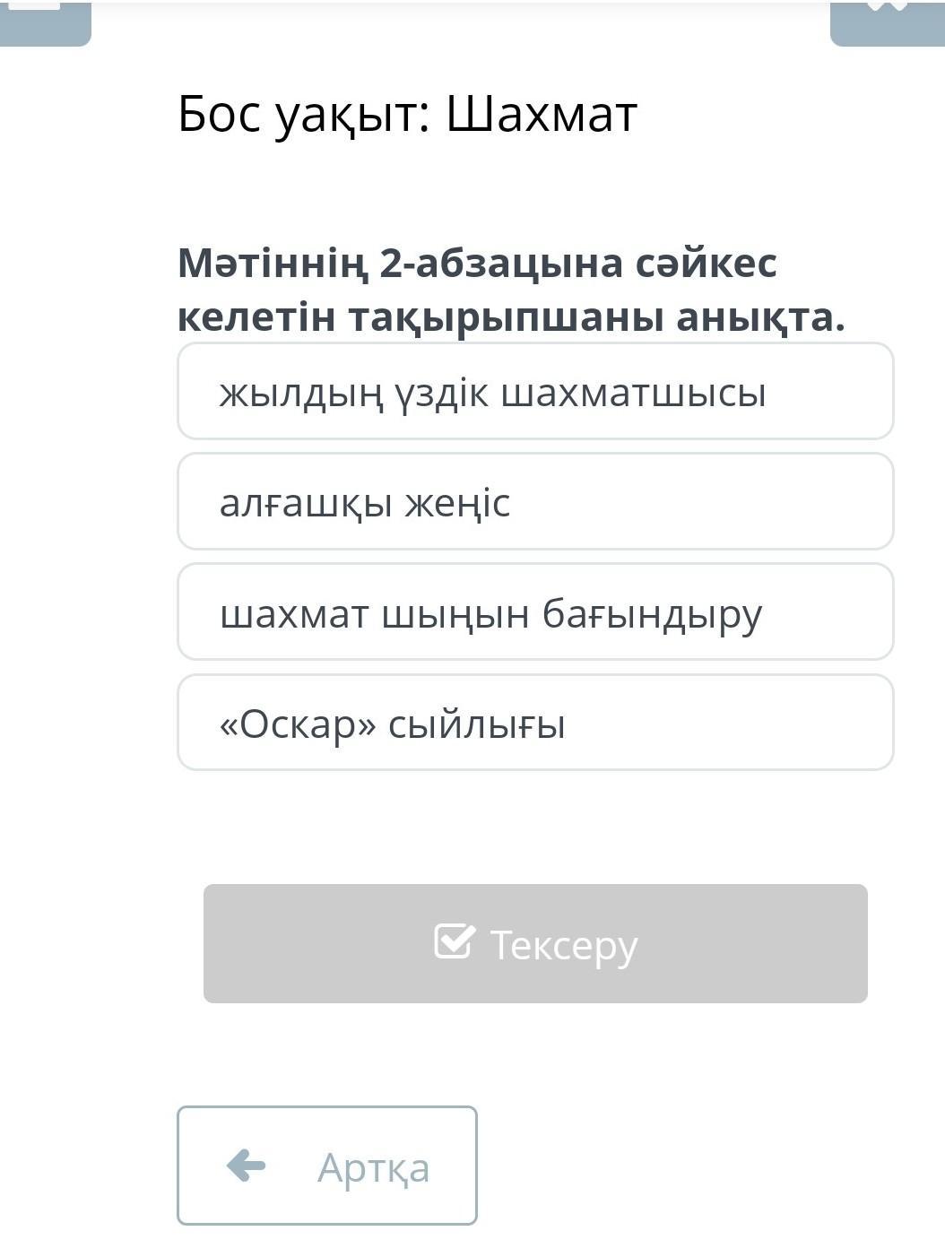Бос уақыт: Шахмат Мәтіннің 2-абзацына сәйкес келетін тақырыпшаны анықта.