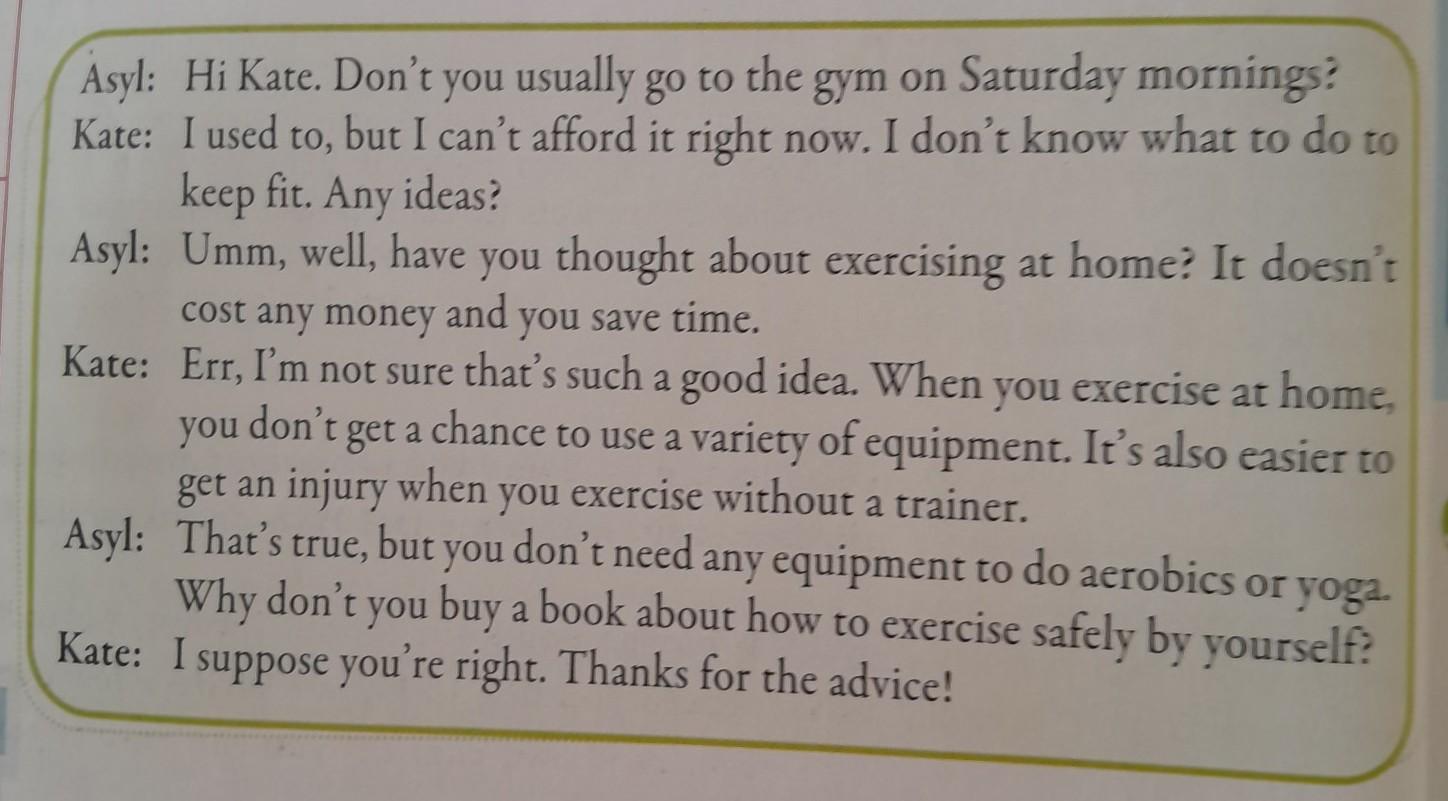 3 Read the dialogue. What does Asyl advise Kate to do? What pros and cons of exercising at home do the speakers mention? помогите пж