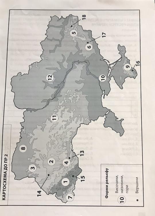 Запішіть назви географічних об'єктів позначених на карті цифрами