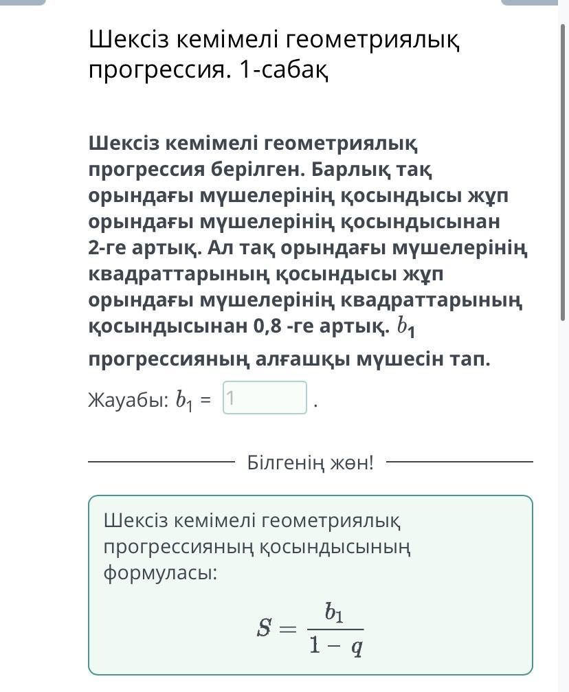Бесконечная убывающая геометрическая прогрессия. Урок 1 Дана бесконечная убывающая геометрическая прогрессия. Сумма всех слагаемых с нечетными номерами в 2 раза больше суммы слагаемых с четными номерами. А сумма квадратов членов в нечетных местах на 0,8 больше суммы квадратов членов в четных местах. Найдите первый член прогрессии b_{1}. Ответ: б_{1} =