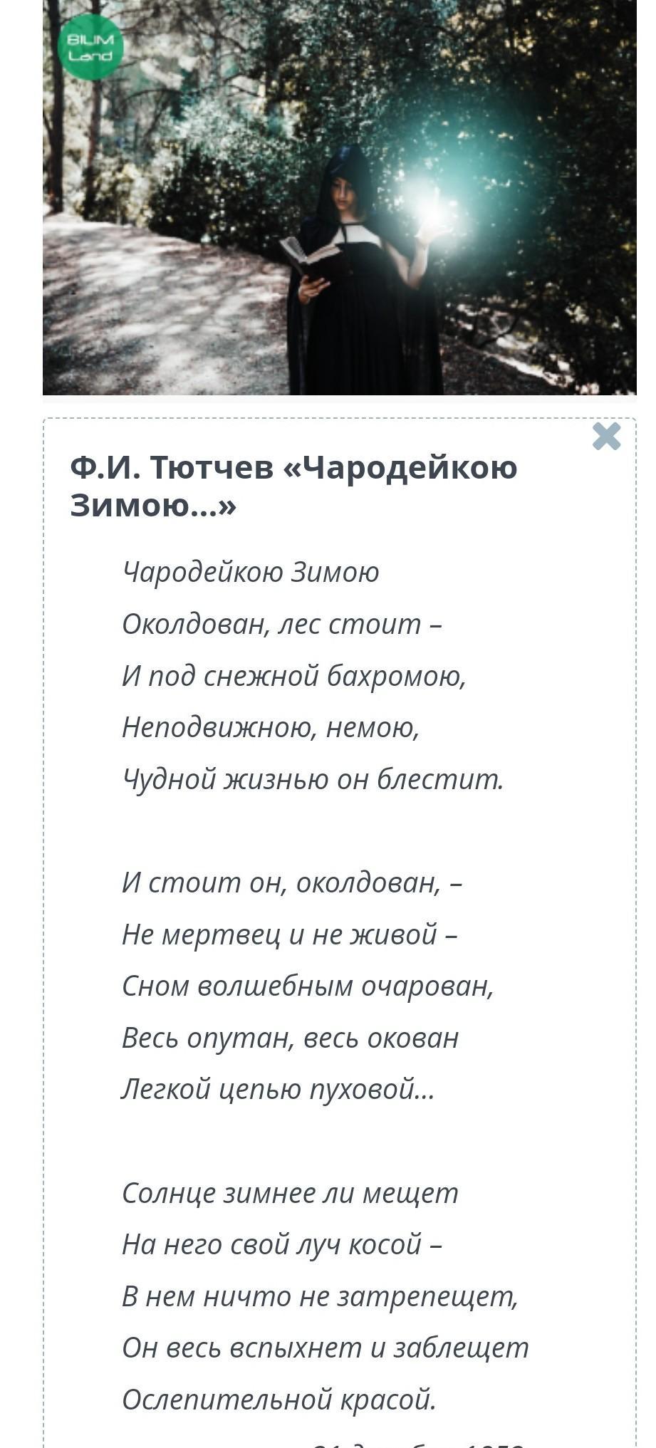 Прочитай текст стихотворения Ф.И. Тютчева «Чародейкою Зимою...». В какой строфе стихотворения появляется данный образ? СРОООЧНООО ХЕЛП