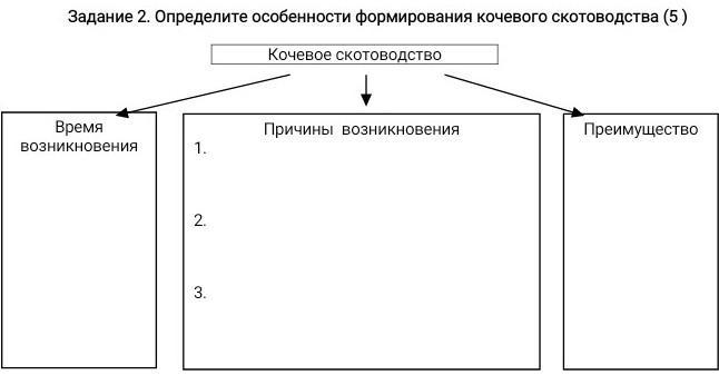 Задание 2. Определите особенности формирования кочевого скотоводства (5) Кочевое скотоводство Время возникновения 1. 2. 3. Причины возникновения Преимущество