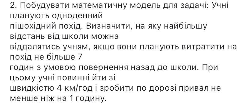 Таким чином, математична модель дозволяє знайти максимальну відстань від школи, яку учні можуть відвідати за умови заданих обмежень.