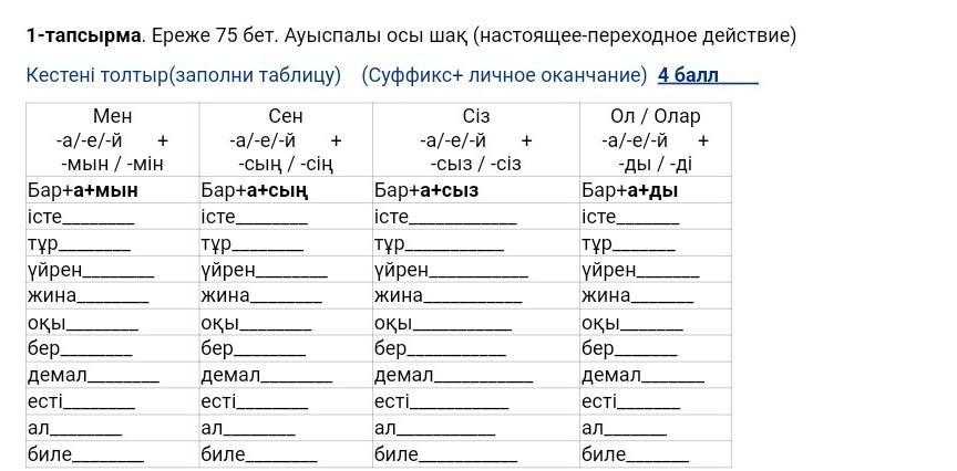 1-тапсырма. Ереже 75 бет. Ауыспалы осы шақ (настоящее-переходное действие) Кестені толтыр(заполни таблицу) (Суффикс+ личное оканчание) 4 балл Мен -а/-e/-й + -мын / -мін Бар+а+мын iсте. тұр. үйрен жина оқы. бер демал естi ал. биле -a/-e/-й -сын/-сiн Сен Бар+а+сың iсте. тұр. үйрен жина. оқы. бер- демал есті ал биле. + Сiз -а/-e/-й оқы. бер- -сыз/-сiз Бар+а+сыз iсте. тұр. үйрен_ жина. демал есті ал биле. + Ол / Олар -а/-e/-й -ды /-дi Бар+а+ды iсте тұр. үйрен жина оқы. бер демал естi_ ал биле. +
