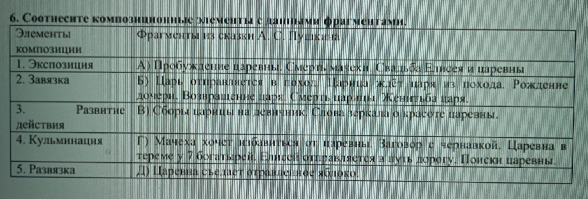 6. Соотнесите композиционные элементы с данными фрагментами. Элементы Фрагменты из сказки А. С. Пушкина Композиции 1. Экспозиция 2. Завязка А) Пробуждение царевны. Смерть мачехи. Свадьба Елисея и царевны Б) Царь отправляется в поход. Царица ждёт царя из похода. Рождение дочери. Возвращение царя. Смерть царицы. Женитьба царя. 3. действия 4. Кульминация 5. Развязка Развитие | В) Сборы царицы на девичник. Слова зеркала о красоте царевны. Г) Мачеха хочет избавиться от царевны. Заговор с чернавкой. Царевна в тереме у 7 богатырей. Елисей отправляется в путь дорогу. Поиски царевны. Д) Царевна съедает отравленное яблоко.