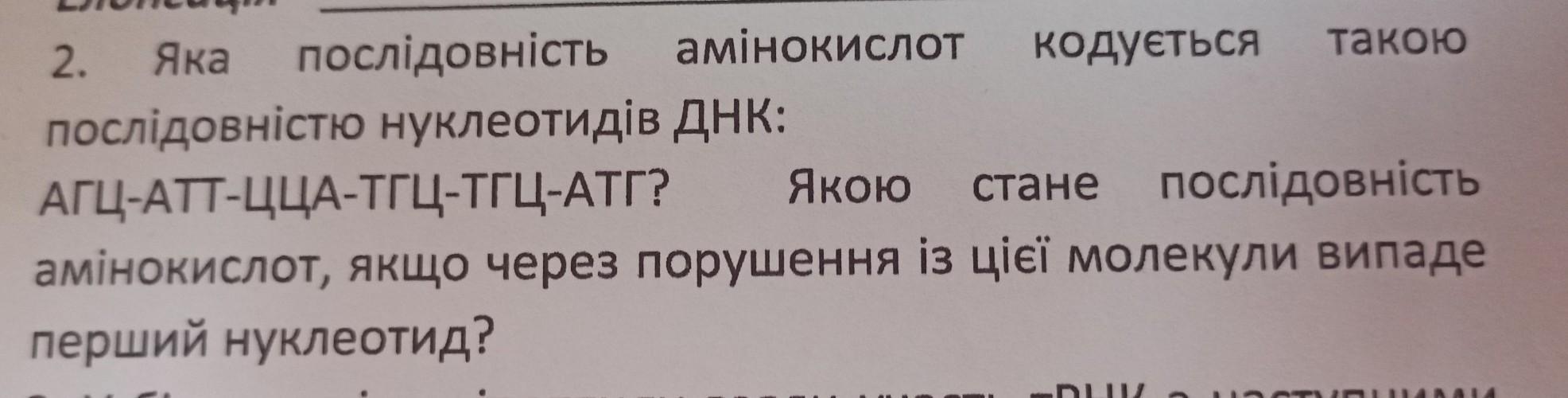 Якщо випаде перший нуклеотид (А), то кодон зміниться, і нова послідовність амінокислот буде: Thr-Leu-His-Leu-Leu-Met.