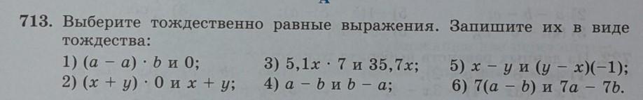713. Выберите тождественно равные выражения. тождества: 1) (a - a) . b и 0; 2) (x + y) . О и x + y; 3) 5,1х - 7 и 35, 7x; 4) a - b и b - a; Запишите их в виде 5) x - у и (у - x)(-1); - 6) 7(a - b) и 7а - 70. -