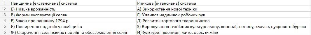 срочно даю 70 срочнооооо)))))))3. З'ясуйте в дві колонки ознаки панщинної (екстенсивної) та ринкової (інтенсивної) систем господарювання: А) Використання нової техніки; Б) Низька врожайність; В) Форми експлуатації селян; Г) З’явився надлишок робочих рук; Д) Розвиток торгового тваринництва; E) Закон про панщину 1794 р.; Є) Поширення податків у поміщиків; Ж) Скорочення селянських наділів та обезземелення селян 3) Вирощування технічних культурб льону, коноплі, тютюну, хмелю, цукрового буряка; И) Культури: пшениця, жито, овес, ячмінь.
