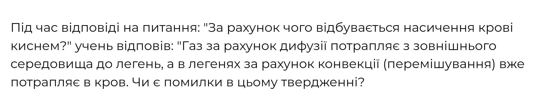 Немає помилок в цьому твердженні. Дифузія дійсно допомагає кисню потрапити з зовнішнього середовища до легень, а потім конвекція (перемішування) допомагає кисню потрапити з легень до крові.