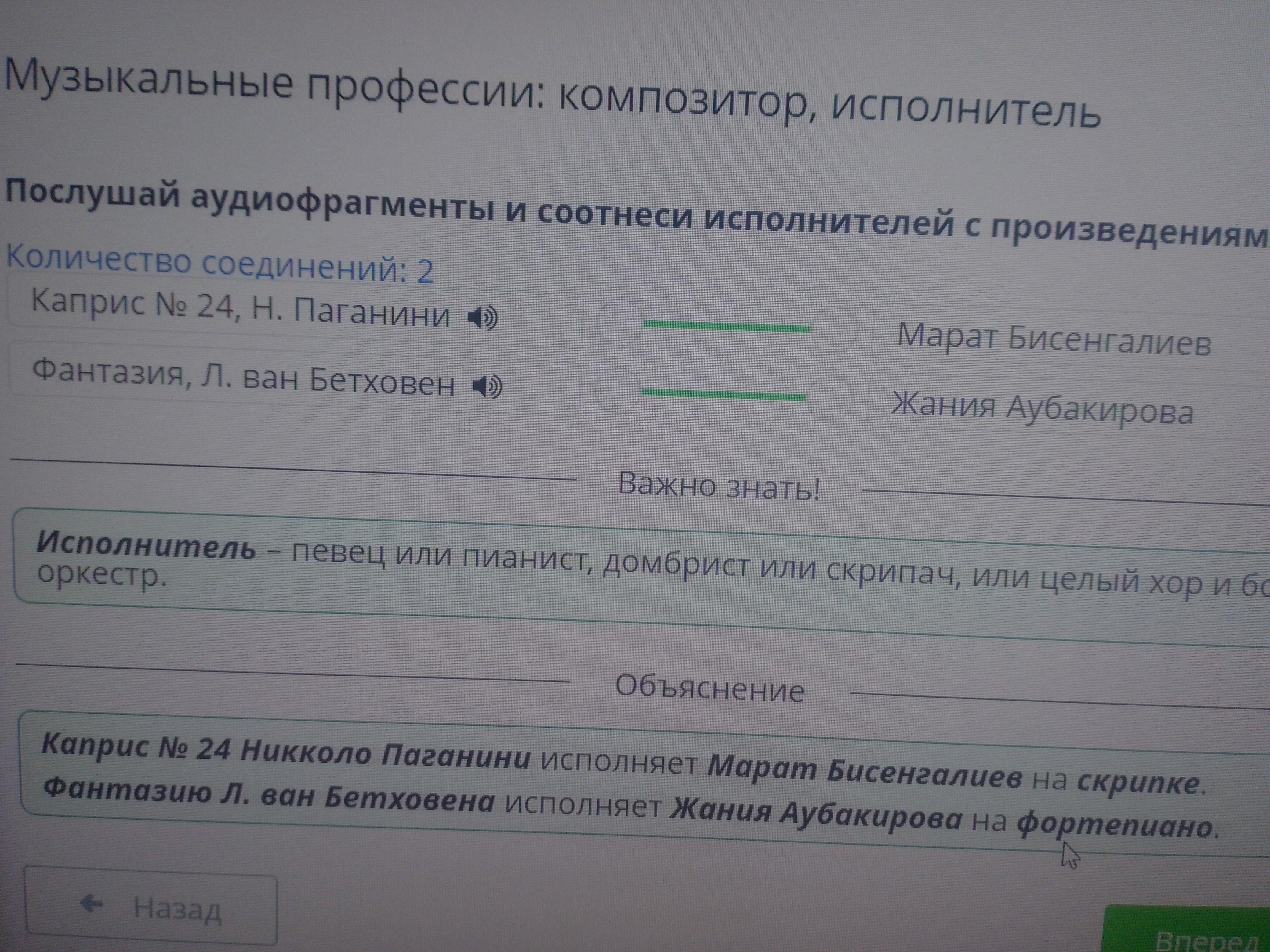 Музыкальные профессии: композитор, исполнитель Послушай аудиофрагменты и соотнеси исполнителей с произведениями. Каприс № 24, Н. Паганини » Фантазия, Л. ван Бетховен Марат Бисенгалиев Жания Аубакирова